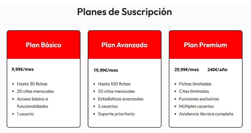 “Pensado para profesionales que empiezan a digitalizar su negocio. Incluye hasta 30 fichas, 20 citas mensuales, acceso básico a las funcionalidades y 1 usuario.”